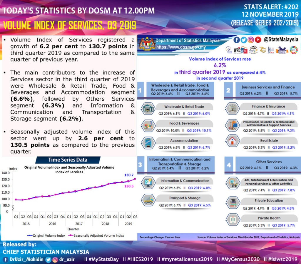 The main contributors to the increase of Services sector in the third quarter of 2019 were Wholesale & Retail Trade, Food & Beverages and Accommodation segment (6.6%), followed by Others Services segment (6.3%) and Information & Communication and Transportation & Storage segment (6.2%).