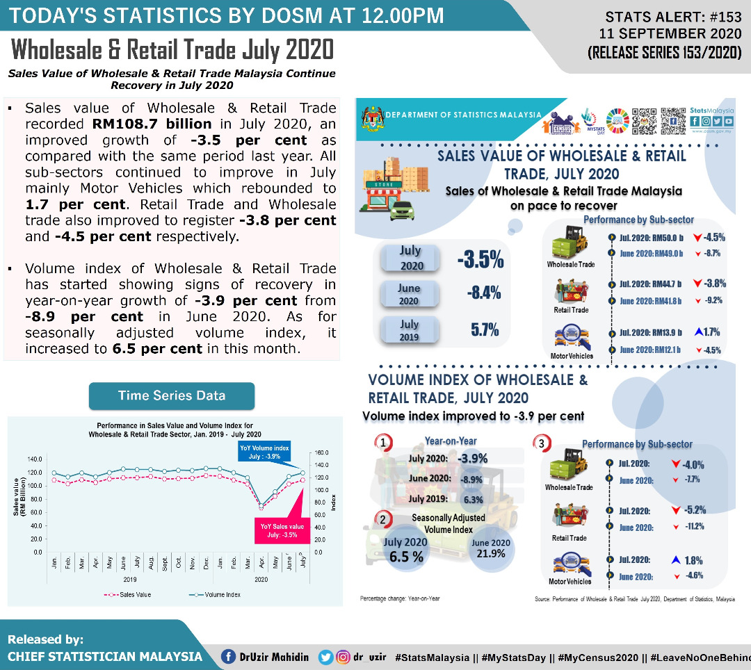 Sales value of Wholesale & Retail Trade recorded RM108.7 billion in July 2020, improved growth of -3.5% as compared with the same period last year. All sub-sectors continued to improve in July mainly Motor Vehicles which rebounded to 1.7%. Retail Trade and Wholesale trade also improved to register -.38% and -4.5% respectively.